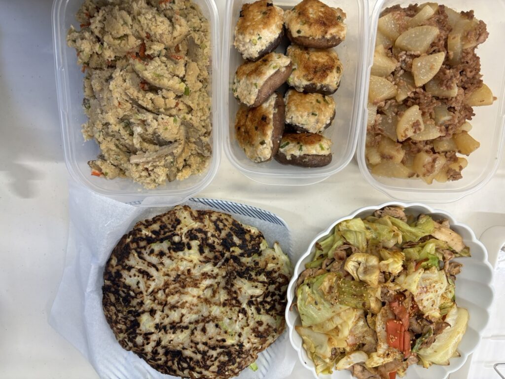レンコンのはさみ焼きやベーコンと白菜のクリーム煮など、お客様のご希望に沿ったメニューに加え、タンパク質をしっかり摂れるお肉料理や、彩りのある野菜料理も組み合わせました。